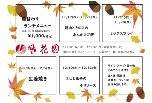 11月19日~12月12日までの週替わりランチメニューになります。